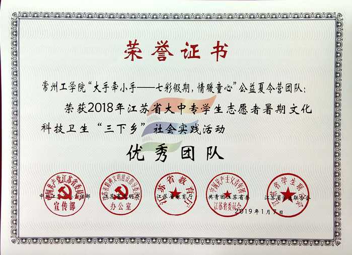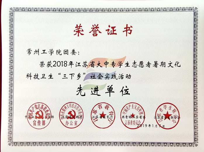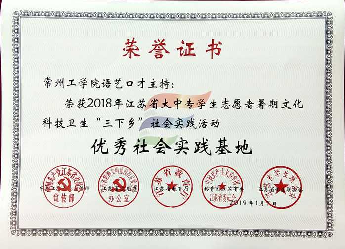 近日,在江苏省高校共青团工作会议上,对2018年江苏省“三下乡”社会实践活动集体和个人进行表彰。我校团委获评2018年江苏省“三下乡”社会实践活动先进单位。艺术与设计学院“追寻辉煌足迹重温红色记忆”小分队、校团委“大手牵小手——七彩假期情暖童心”公益夏令营团队获评优秀团队。经济与管理学院提交的调研报告《应用型本科“第二课堂成绩单”开展情况的调查与满意度评价分析》获优秀。校友孙胜珊创建的语艺口才主持中心获评优秀社会实践基地。土木建筑工程学院戴崇江、光电工程学院柏叶辰两位同学获评先进个人。马克思主义学院徐进、经济与管理学院徐霞两位教师获评先进工作者。
