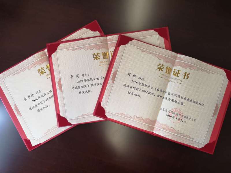 近日,江苏省人民政府台湾事务办公室发布《关于2018年全省涉台调研课题结项情况的通报》。由我校李菼、刘松、金中坤等教师提交的调研报告《台湾青年来苏就业创业意愿调查和促进政策研究》被评为优秀课题成果。