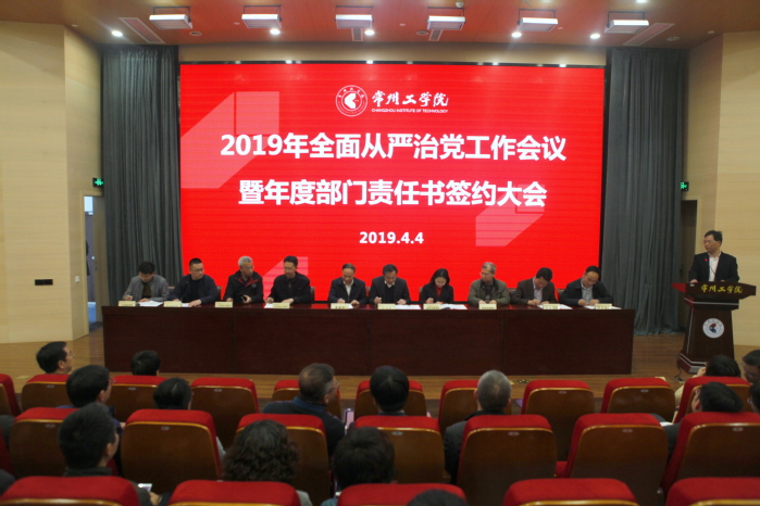 4月4日,我校召开2019年全面从严治党工作会议暨部门责任书签约大会,旨在深入学习贯彻习近平总书记在十九届中央纪委三次全会上的重要讲话精神和全会精神,持续推进学校全面从严治党工作,为促进学校高质量发展,实现建设特色鲜明的高水平应用型地方大学的奋斗目标,提供坚强的政治和纪律保障。全体校领导、党委常委,全校中层干部参加会议。
