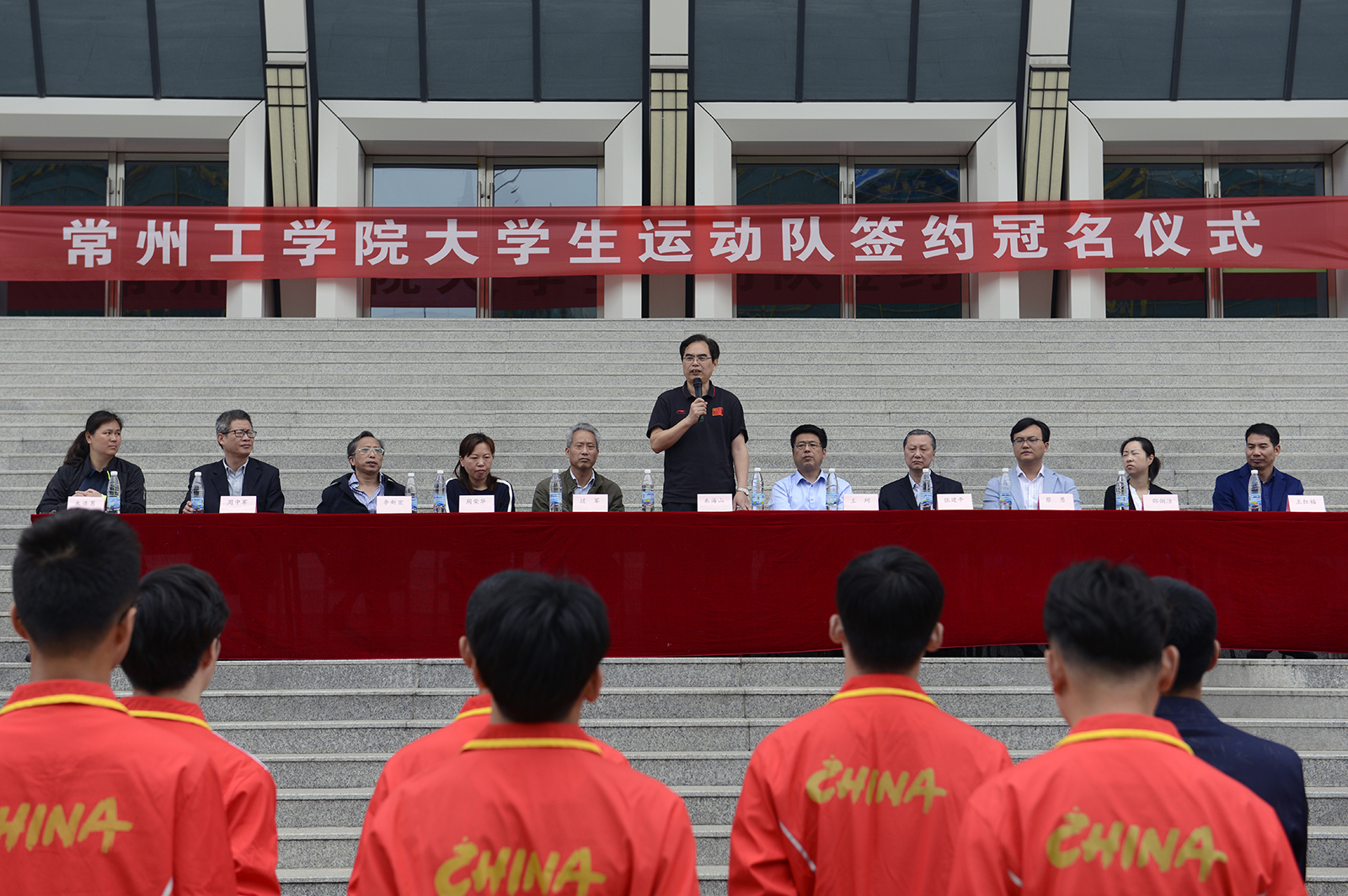 校舞龙队表演拉开签约仪式的序幕。随后,体育教学部群体竞赛中心主任朱亚男介绍了本次签约的五支校运动队相关情况。中国移动通信集团江苏有限公司常州新北分公司副总经理蔡勇代表各冠名单位发言,表示非常高兴捐资助建我校运动队,今后将努力构建双方合作发展的新平台、新机制,为我校运动队发展提供积极支持。资产经营有限公司董事长王珂希望校运动队全体师生心怀感恩之心,努力训练,提高水平,回报企业的支持与关爱。
