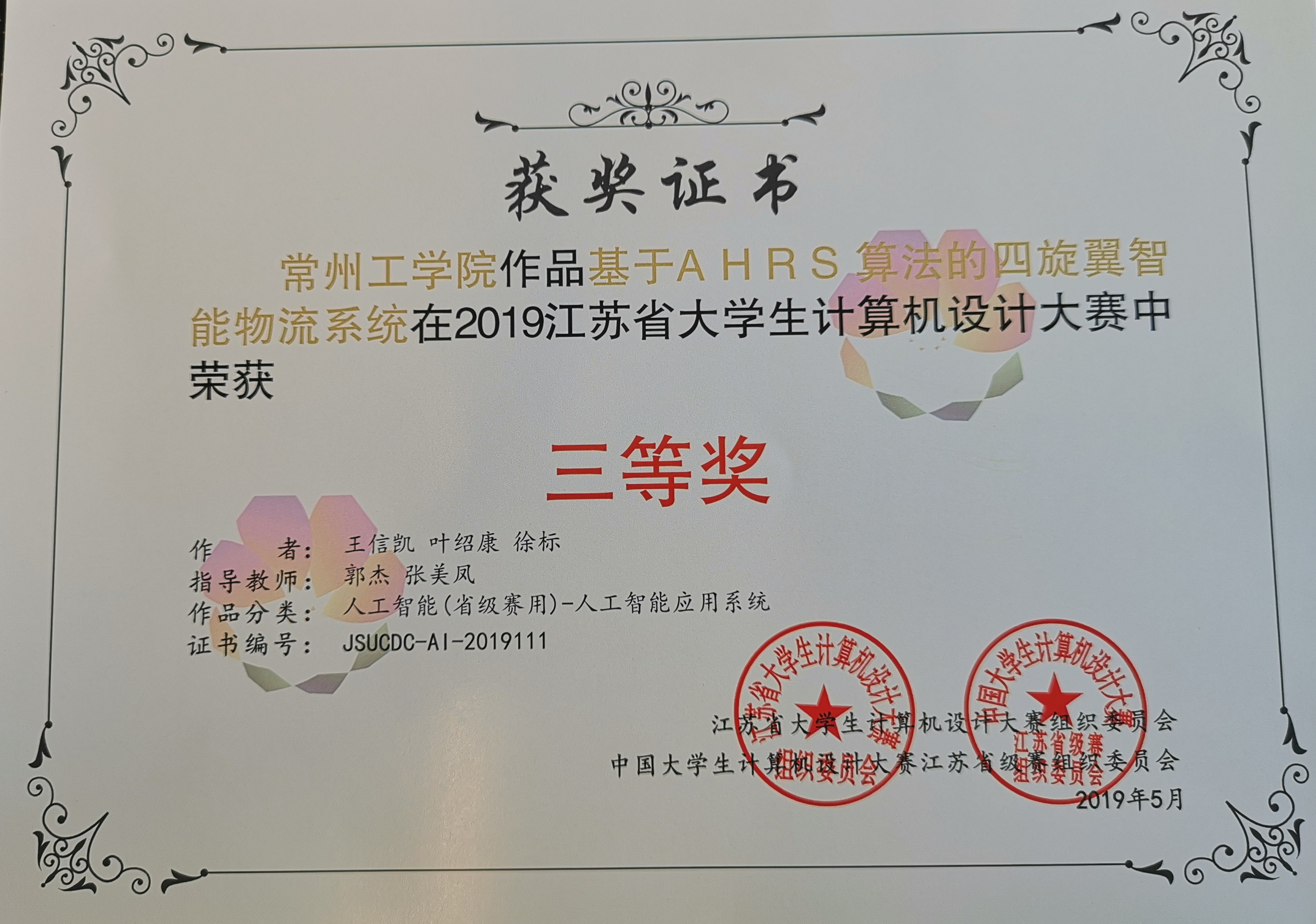 5月17日至19日,2019年江苏省大学生计算机设计大赛暨2019中国大学生计算机设计大赛江苏省级赛决赛在中国矿业大学举行。我校光电工程学院郭杰、张美凤老师指导,王信凯、叶绍康和徐标完成的《基于AHRS算法的四旋翼智能物流系统》获人工智能应用系统类三等奖;郭杰、李辉老师指导,王晓波、那晏康和王金金完成的《热力学虚拟教学实验平台》获微课与教学辅助类三等奖。