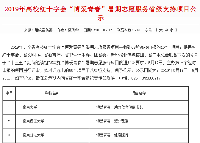 近日,江苏省红十字会发布《2019年高校红十字会“博爱青春”暑期志愿服务省级支持项目公示》,我校“心之所栖—候鸟儿童关爱行动”(指导老师:徐霞 陆婷)项目从65所高校申报的107个项目中脱颖而出,成功立项。