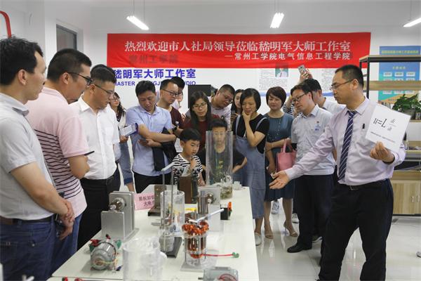 近日,在常州市人力资源和社会保障局牵头组织的技能大师工作室创建现场观摩活动中,来自全市相关单位的40余人对我校嵇明军技能大师工作室进行走访参观。副校长张兵偕教务处、创新创业学院相关人员随行考察。