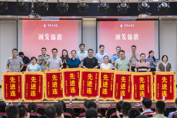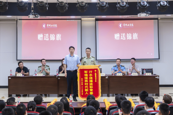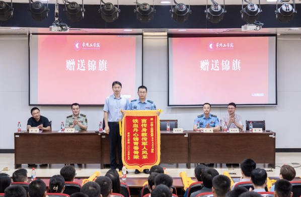刘春节向两支承训部队赠送锦旗,感谢承训官兵们以高度的责任感和精湛的军事素养,为2025级新生上了一堂生动深刻的国防教育课,展现了新时代军人的风采与担当。